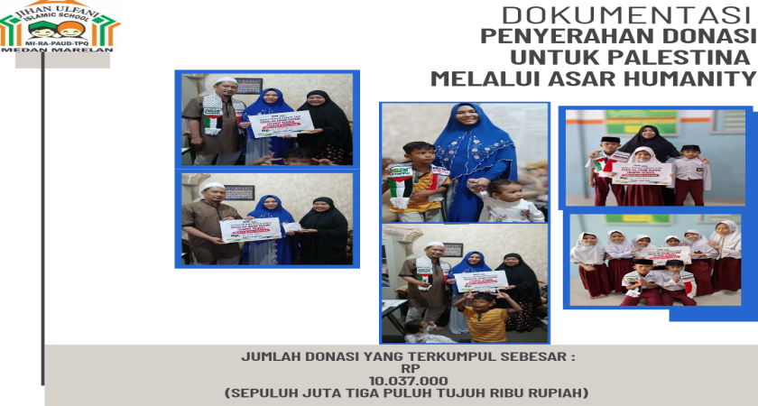 Alhamdulillah, telah diserahkan donasi dari JIHAN ULFANI ISLAMIC SCHOOL UNTUK PALESTINA sebesar Rp 10.037.000 ke Asar Humanity pada hari, Sabtu tanggal 12 April 2025.